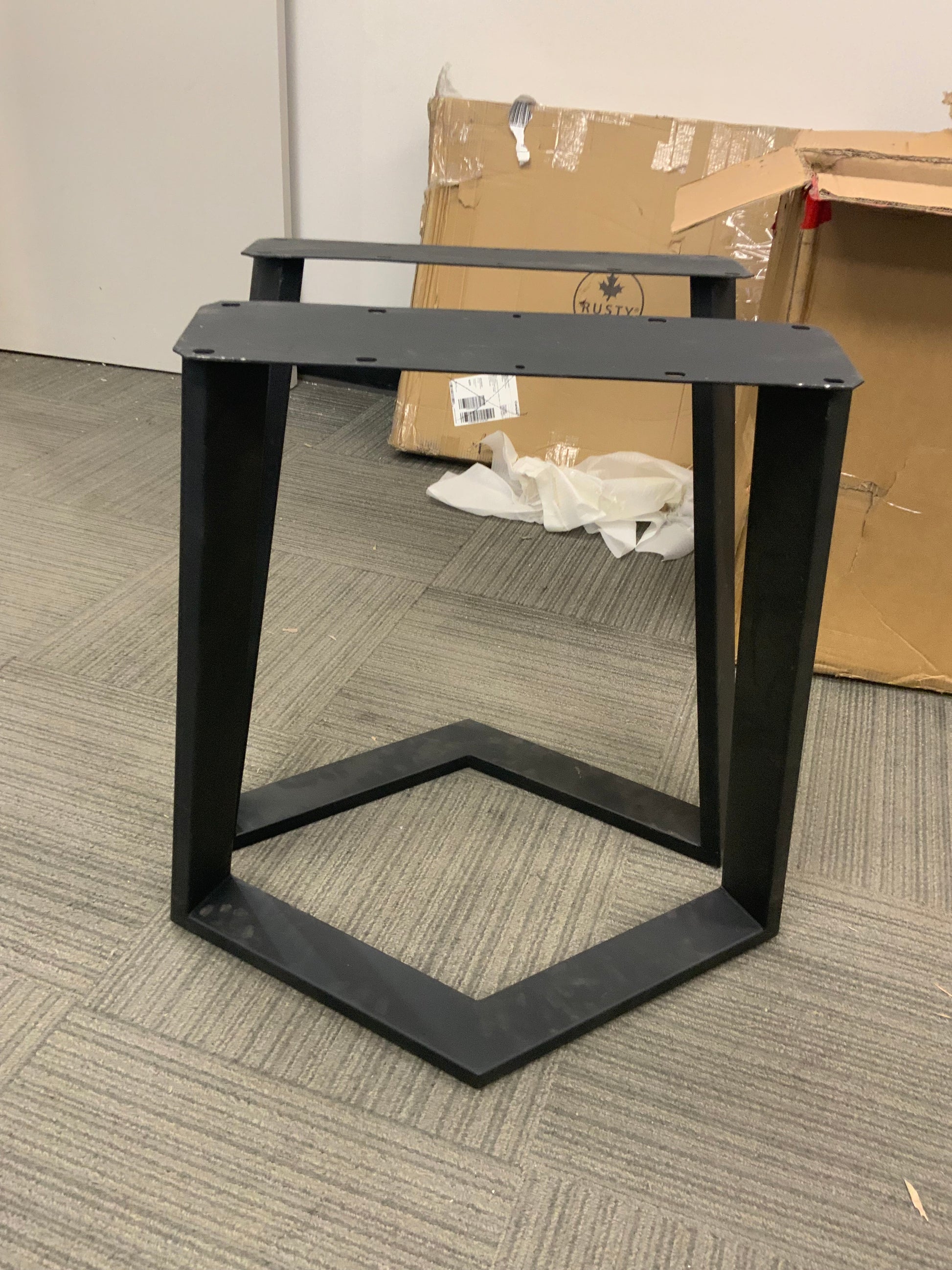 28" wide at bottom, 19.5" wide at top plate, 28" tall, very wide top plate 4.75". Made in steel tubing 3" x 1", black powder coated.